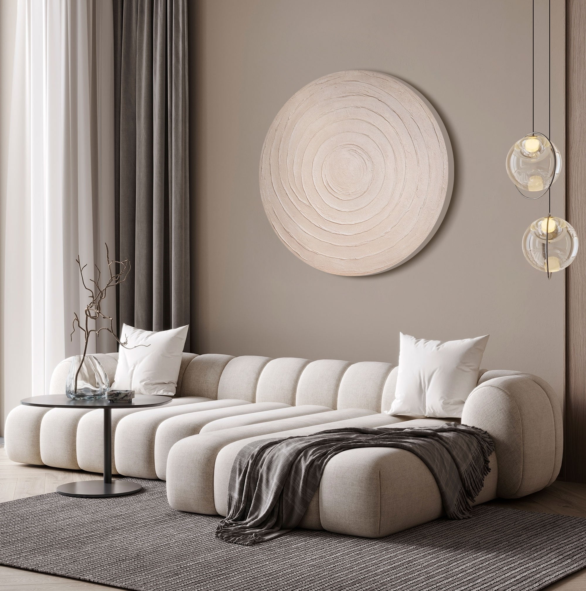Als stilvolles Acrylbild Beige überzeugt das Motiv durch seine ruhige Farbpalette. Die Komposition harmoniert perfekt mit dem Trend zu Pastellfarben Bildern, die Interieurs eine ausgewogene Atmosphäre verleihen. Da die runde Leinwand auf einen speziellen Keilrahmen gespannt ist, setzt das Werk auf eine puristische Objektwirkung. Diese warmen Farben Bilder strukturieren Räume auf elegante Weise, ohne sie optisch zu überladen.
