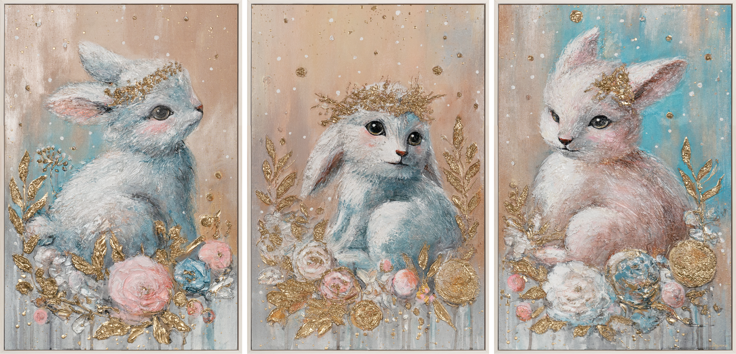 Schaffen Sie eine zauberhafte Atmosphäre im Kinderzimmer mit unserer einzigartigen Wanddekoration für Kinder! Dieses bezaubernde Triptychon zeigt drei süße Hasen, umgeben von sanften Pastelltönen und floralen Elementen mit goldenen Akzenten. Die perfekte Kinderzimmerdeko, um eine gemütliche und inspirierende Atmosphäre zu schaffen.