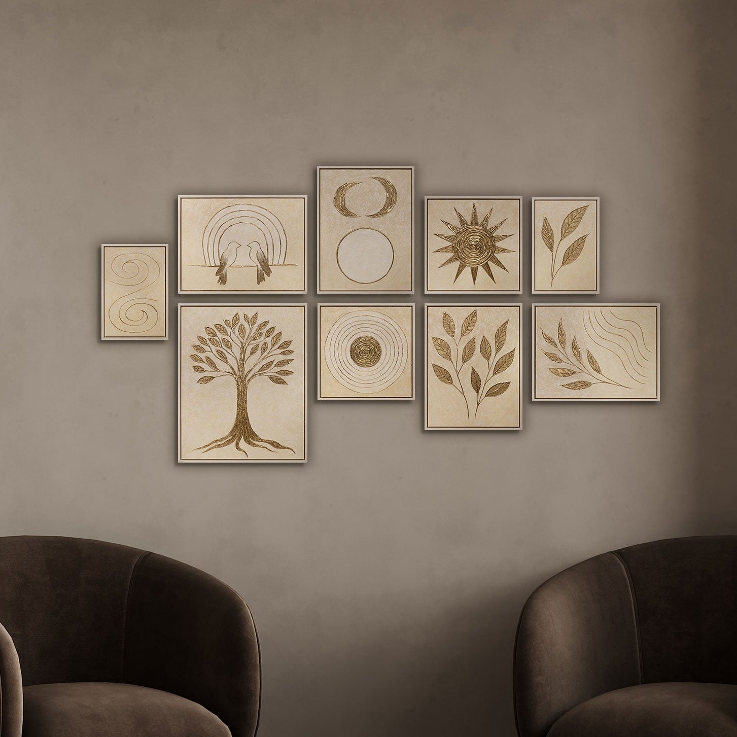 „Flüstern des Laubs“ verbindet die ruhige Eleganz von Blättern mit dem lebendigen Akzent eines kleinen Vogels. Warme Beige- und Goldtöne bilden die harmonische Grundlage des Bildes, während der blaue Vogel einen frischen, lebendigen Kontrast setzt. Die feine Struktur der Oberfläche und die stilisierte Darstellung der Natur verleihen dem Werk eine moderne, zugleich zeitlose Ausstrahlung.