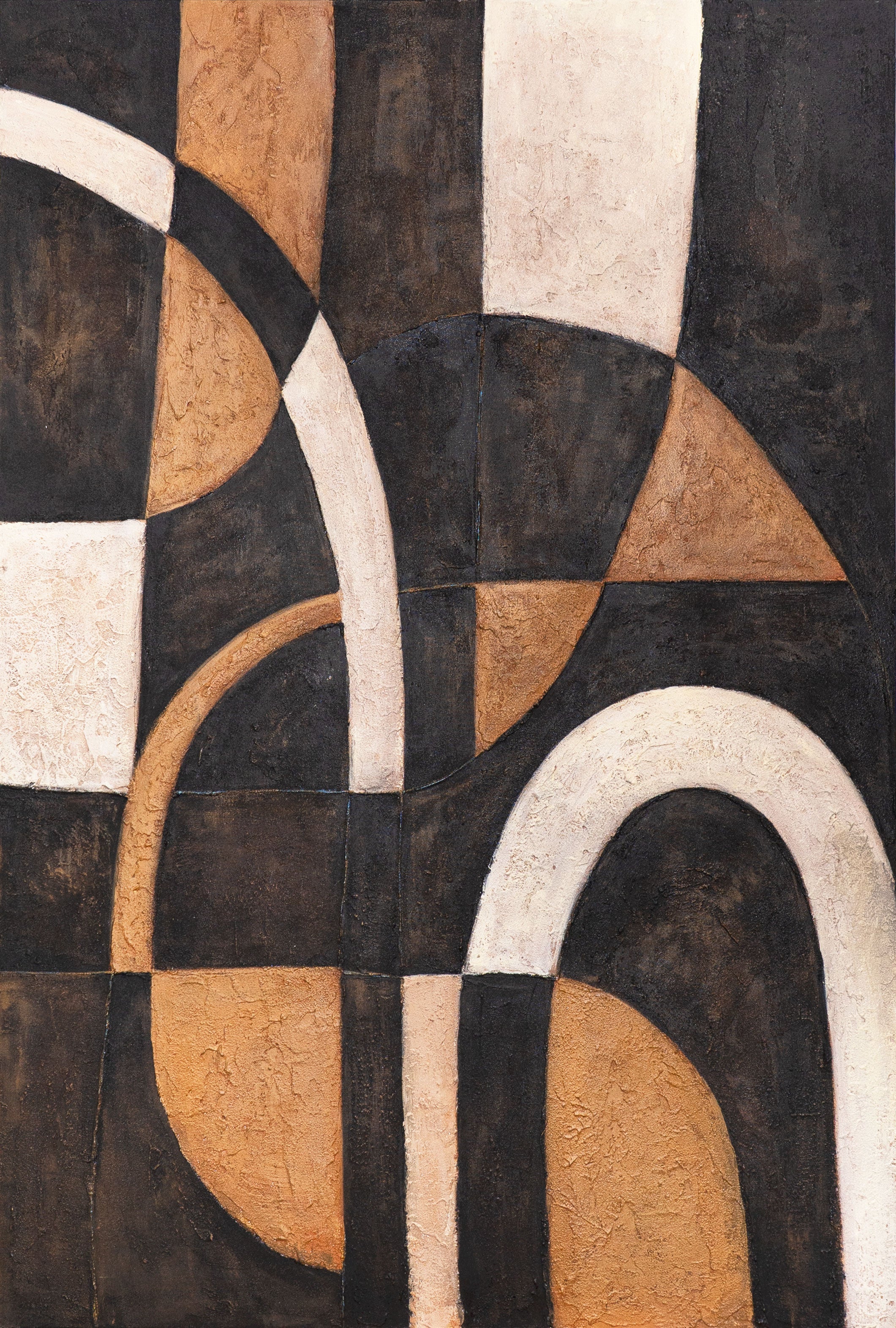 Dieses handgemalte Kunstwerk fasziniert mit einem Spiel aus geschwungenen Linien und geometrischen Flächen. Die Kombination aus warmem Braun, edlem Beige und tiefem Schwarz schafft ein harmonisches Zusammenspiel von Kontrasten. Die strukturierte Oberfläche verleiht dem Gemälde Tiefe und Charakter, wodurch es zu einem echten Blickfang wird.
