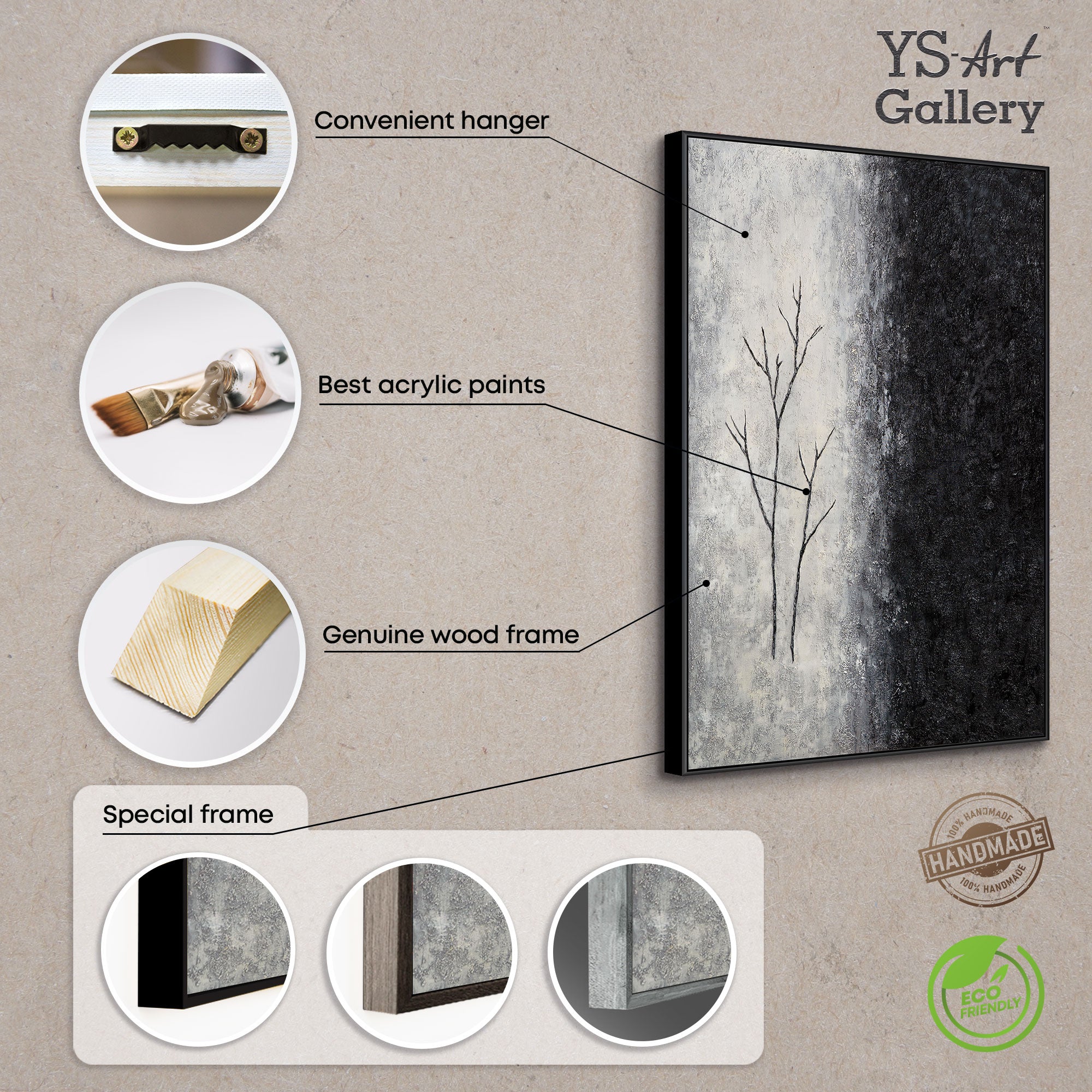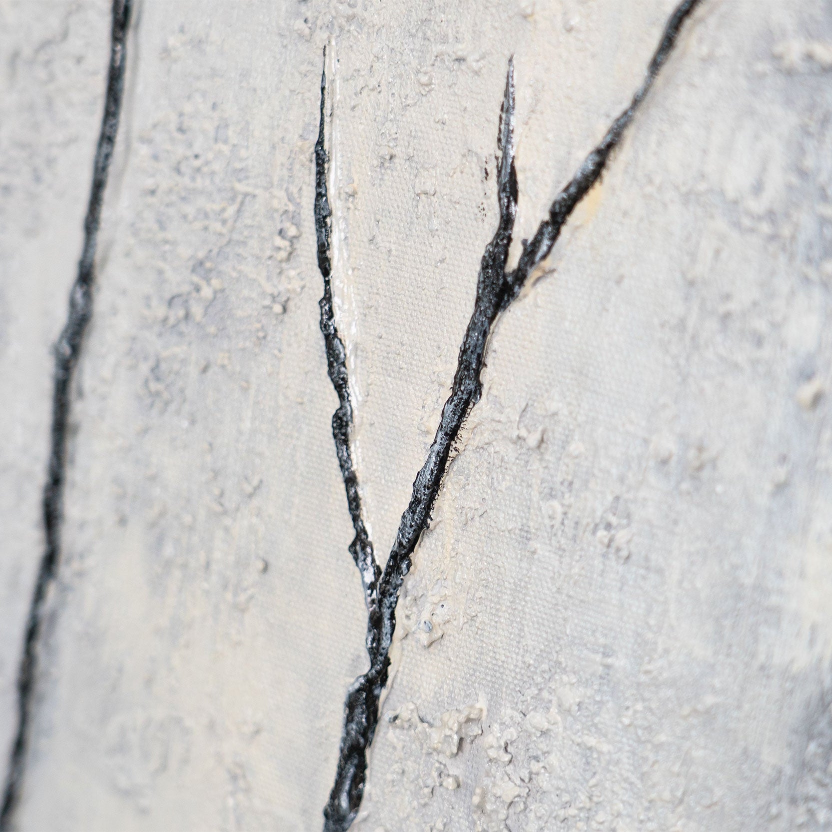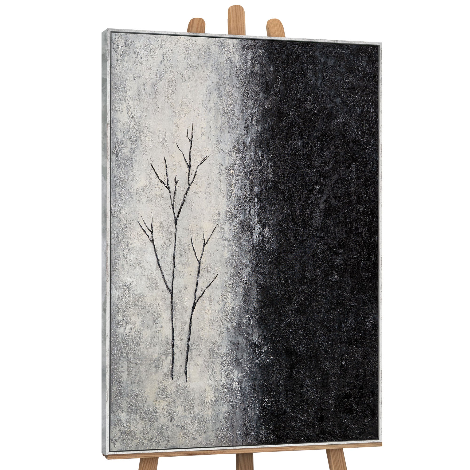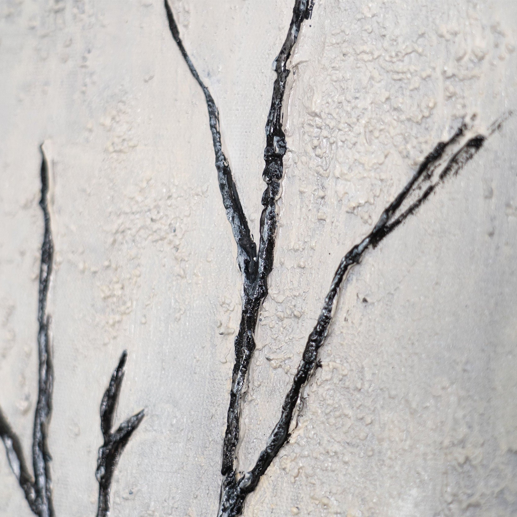 „Atem des Winters“ vereint Stille und Tiefe. Ein einzelner Baum erhebt sich zwischen hell und dunkel, als Symbol für Ruhe und Vergänglichkeit. Die kontrastreiche Farbfläche in Schwarz und Weiß verleiht dem Werk eine starke emotionale Präsenz, während die strukturierte Oberfläche das Motiv greifbar macht.