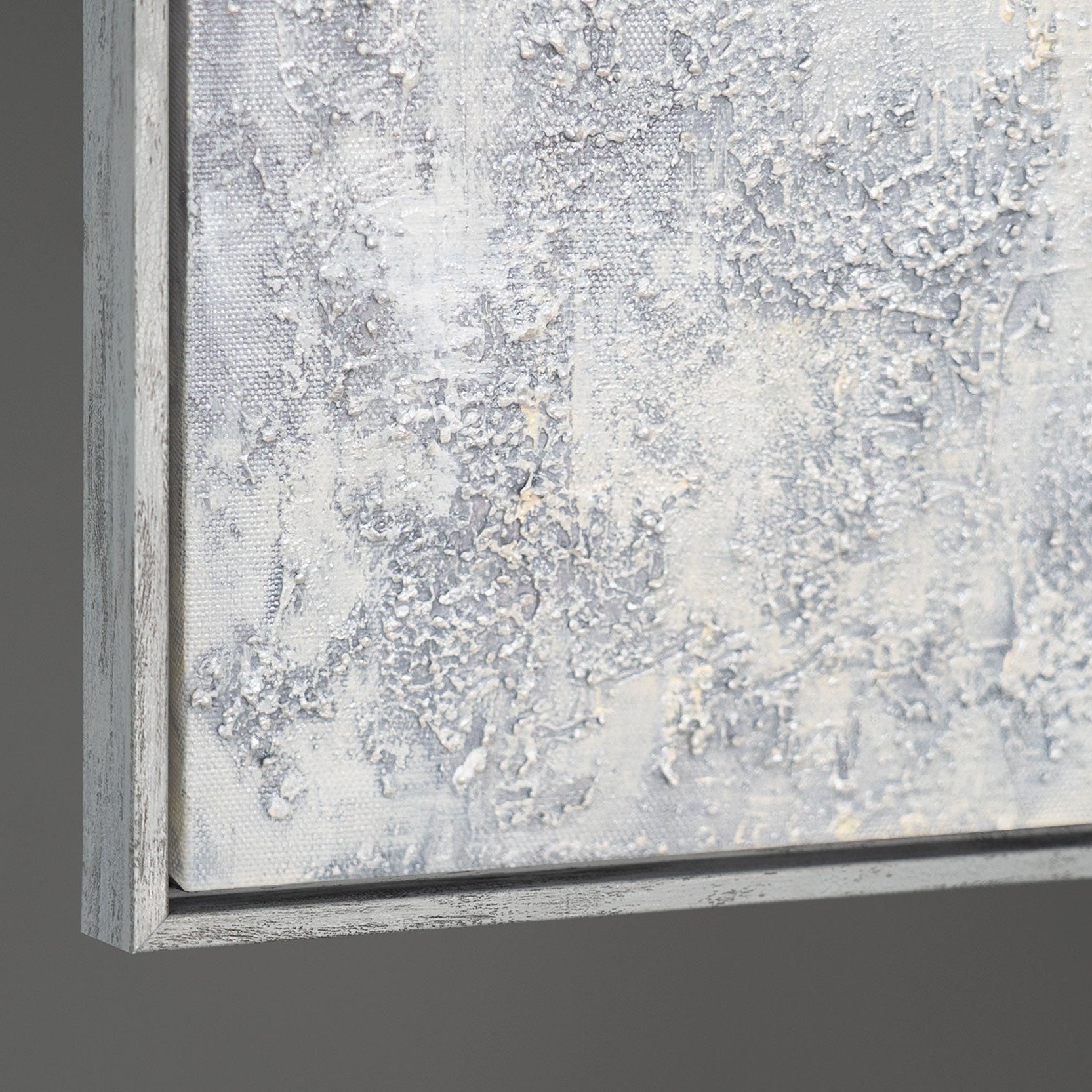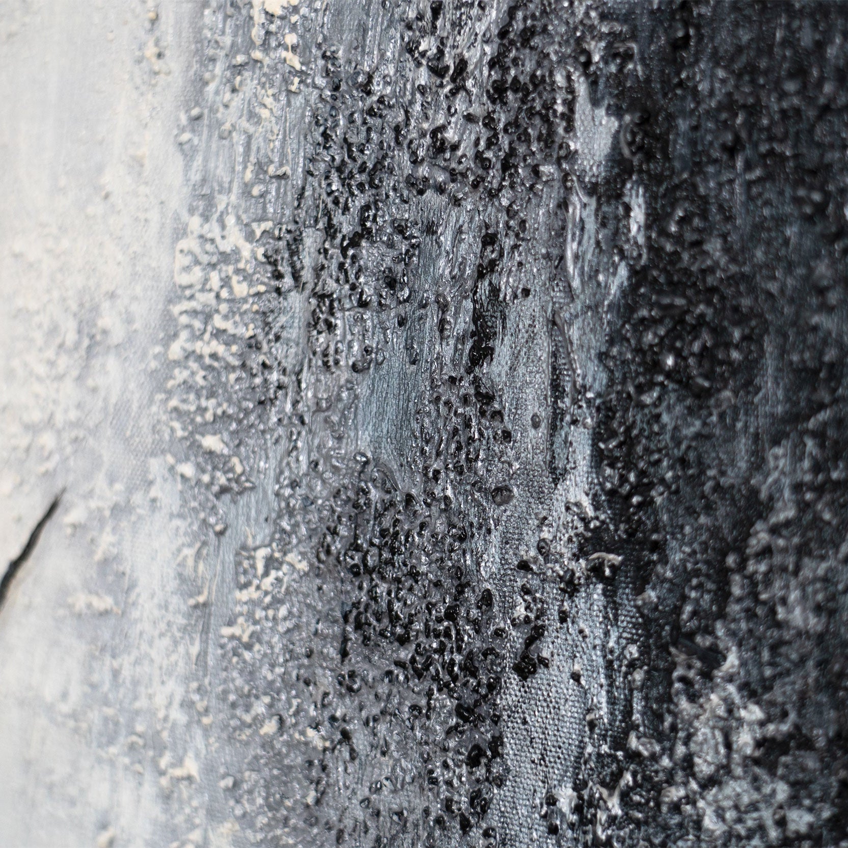 Handgemalte Acrylmalerei mit Rahmen „Atem des Winters“ – Abstrakte Kunst in Schwarz-Weiß