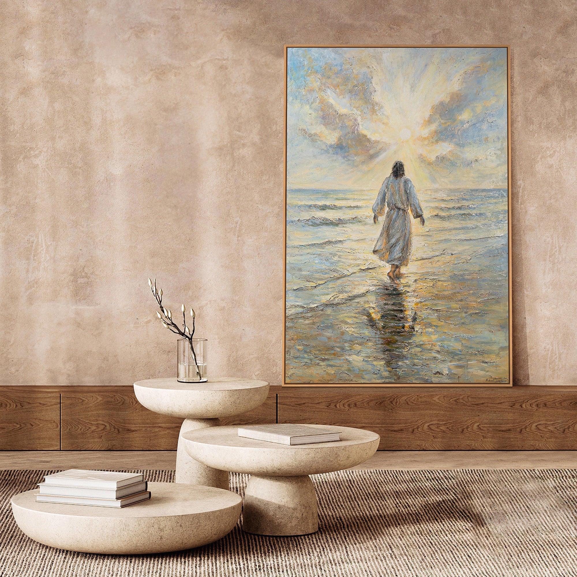 „Weg zum Lichtt“ zeigt eine kraftvolle religiöse Szene – Jesus, der über das Wasser geht, umgeben von strahlendem Licht und den sanften Farben des Himmels. Die Darstellung von Christus am Meer symbolisiert das Licht der Hoffnung und die göttliche Präsenz. Dieses Meisterwerk erweckt ein Gefühl von Frieden und spiritueller Erleuchtung und passt perfekt in jedes christliche Zuhause.