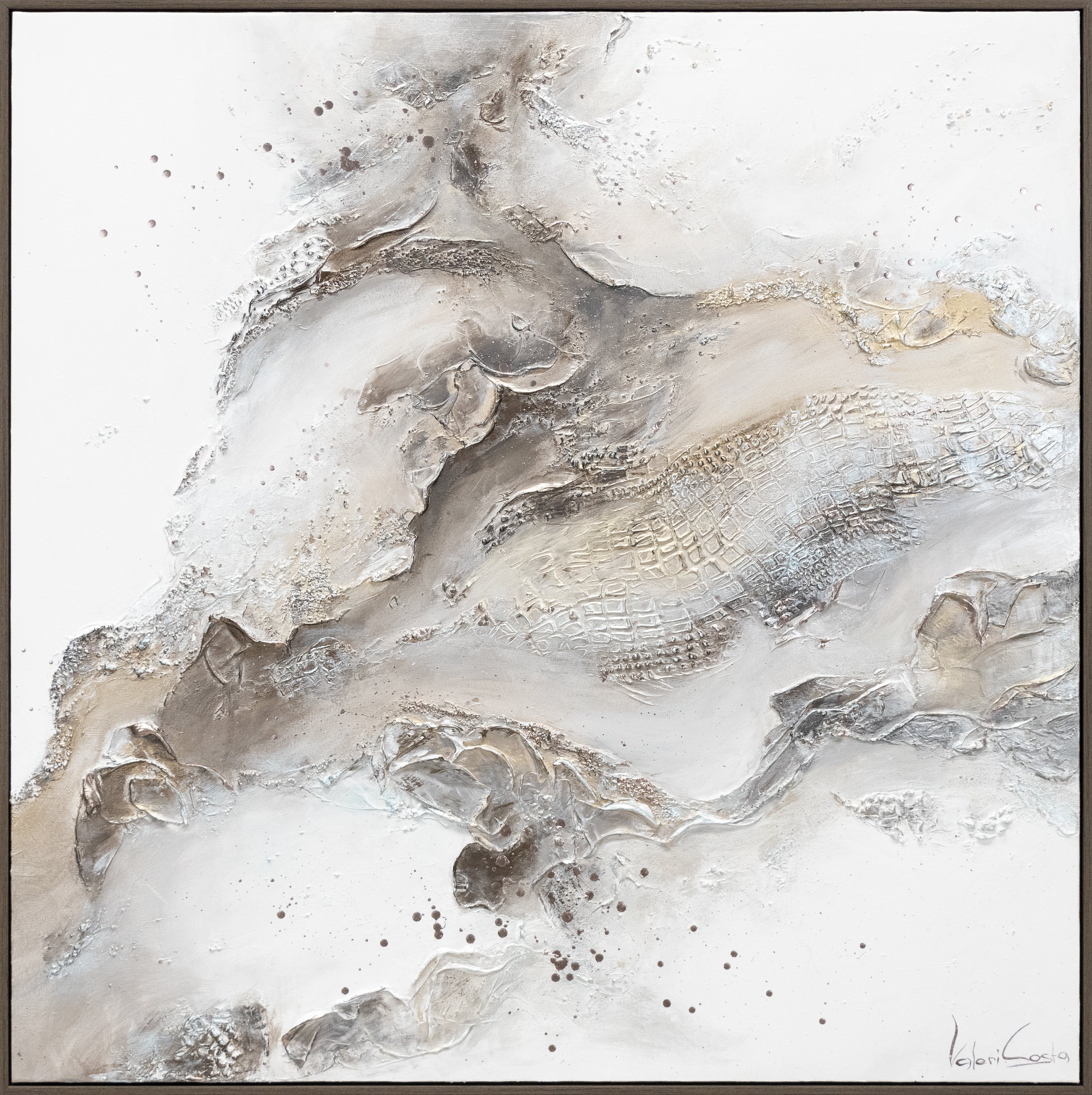„Erschaffung“ ist ein harmonisches, handgemaltes Acrylgemälde mit reich strukturierter Oberfläche in neutralen Naturtönen. Die Kombination aus Weiß, Beige und Grau mit feinen Texturdetails und zarten Akzenten in Gold erzeugt eine abstrakte Landschaft, die durch Tiefe und Bewegung beeindruckt. Die Mischung aus rauer Struktur und sanften Farbverläufen verleiht dem Werk eine besondere Lebendigkeit und Modernität.