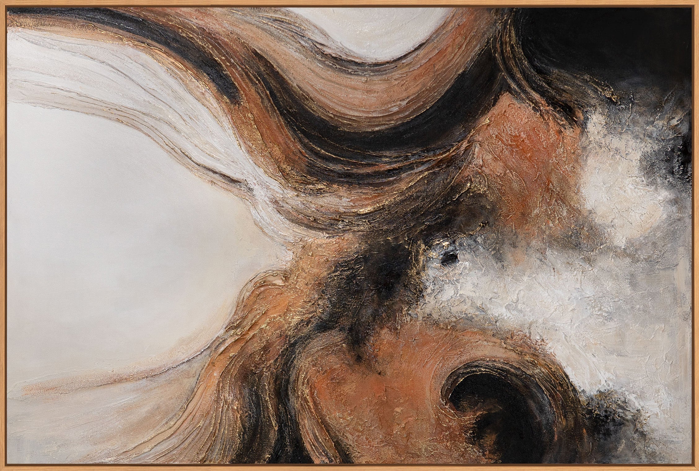 Das handgemalte Leinwandbild wird im Rahmen präsentiert und eignet sich ideal als moderne Wandkunst für Wohnzimmer, Essbereich oder stilvolle Arbeitsräume. Die ausdrucksstarke Struktur verleiht dem Raum Energie und Charakter, ohne dabei unruhig zu wirken, und fügt sich harmonisch in zeitgenössische Interieurs ein.