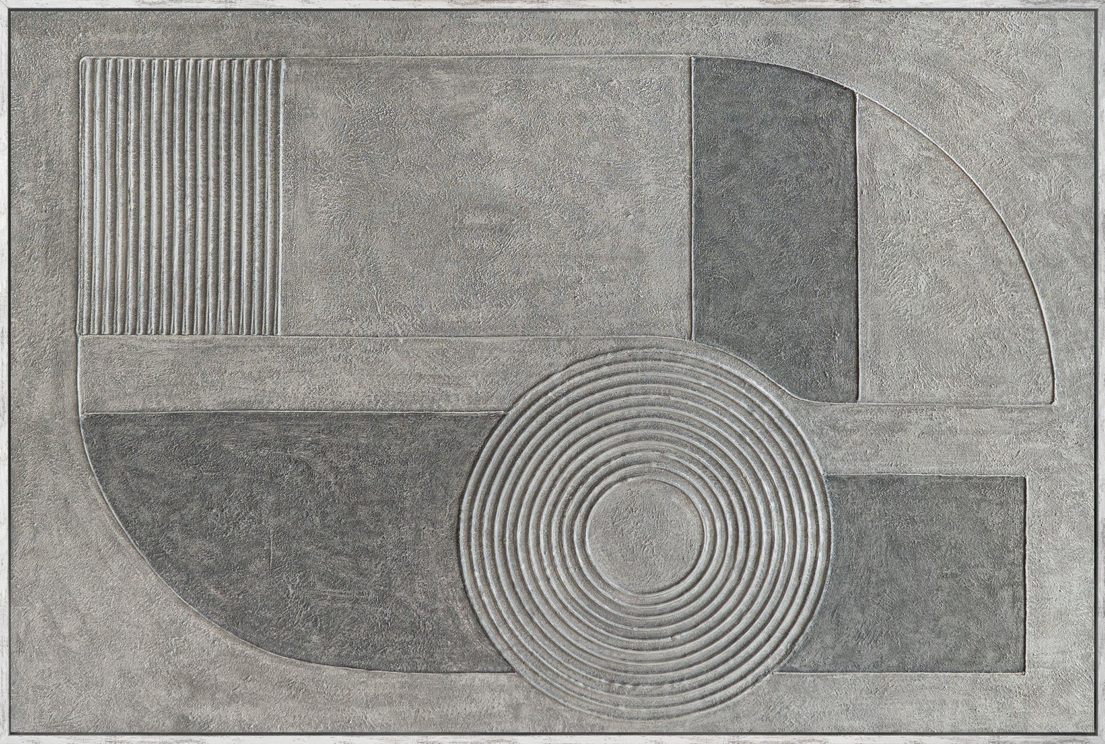 Das abstrakte Gemälde „Grauer Akkord“ entfaltet seine Wirkung durch ruhige geometrische Formen, konzentrische Kreise und eine fein strukturierte Oberfläche. Verschiedene Grautöne verbinden sich zu einer harmonischen Komposition, die Tiefe und Ausgewogenheit ausstrahlt, ohne visuell zu dominieren. Die reliefartige Acrylmalerei erzeugt ein spannendes Wechselspiel aus Licht, Schatten und Materialität.