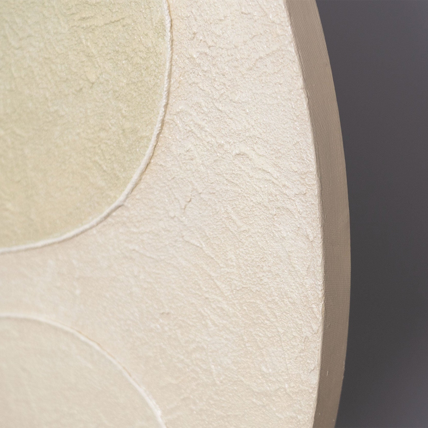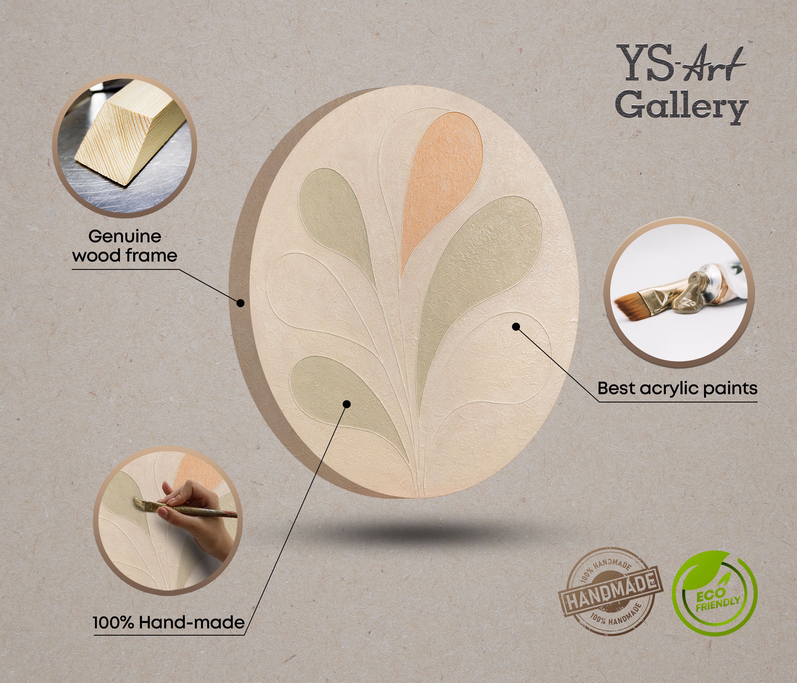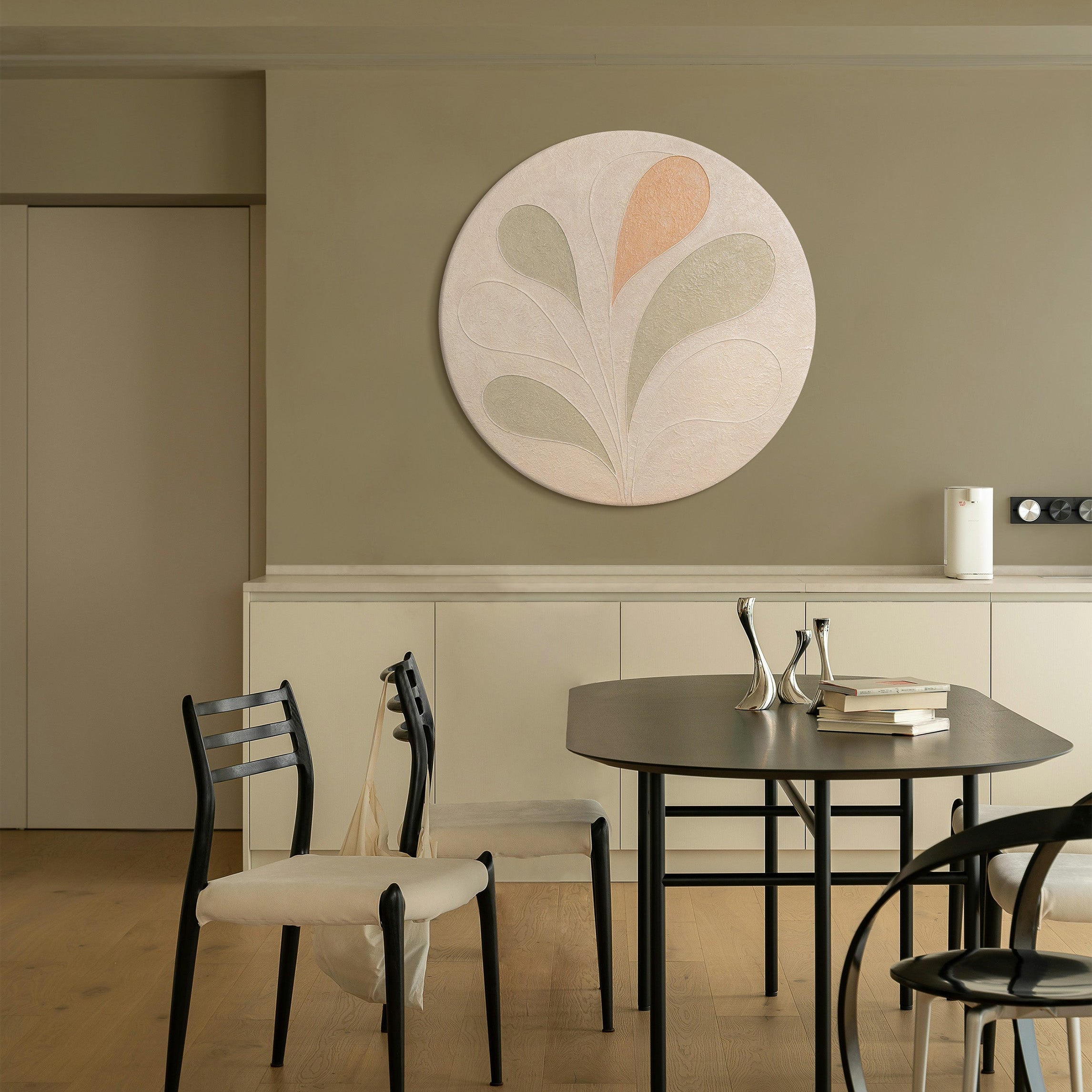 „Zarte Muster“ verbindet organische Formen mit einer ruhigen, harmonischen Farbpalette. Sanft geschwungene Linien entfalten sich wie abstrahierte Blätter oder Tropfen und erzeugen eine elegante Bewegung über die runde Bildfläche. Die warmen Beige-, Creme- und Pastellnuancen verleihen dem Werk eine natürliche Leichtigkeit und schaffen eine Atmosphäre, die zugleich modern und beruhigend wirkt.