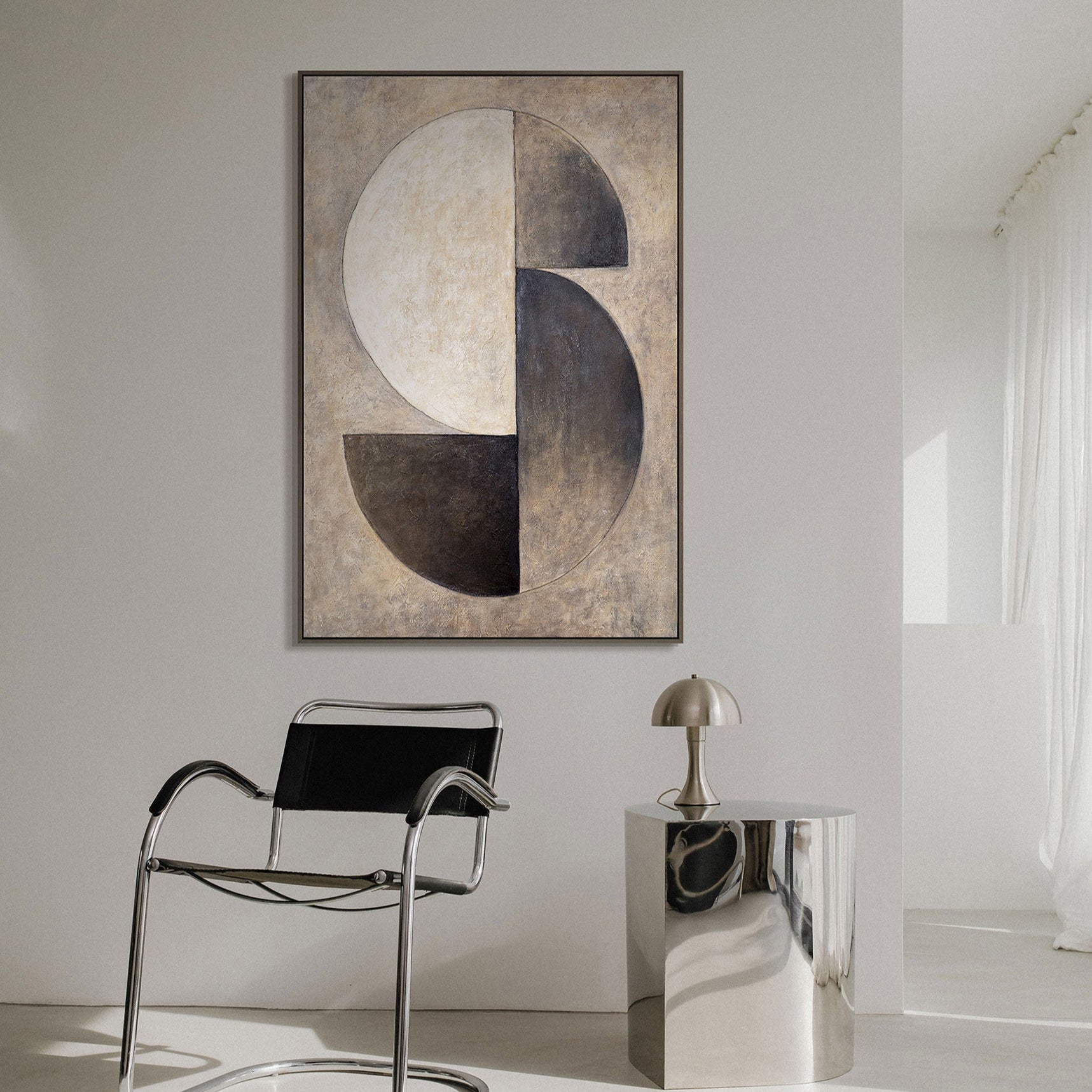 Bringen Sie moderne Klarheit und geometrische Eleganz in Ihr Zuhause mit diesem handgefertigten Wandbild. Die Halbkreise in Schwarz, Weiß und Beige erzeugen ein spannendes Wechselspiel aus Symmetrie und Kontrast – ein Kunstwerk voller Balance und Ausdrucksstärke.