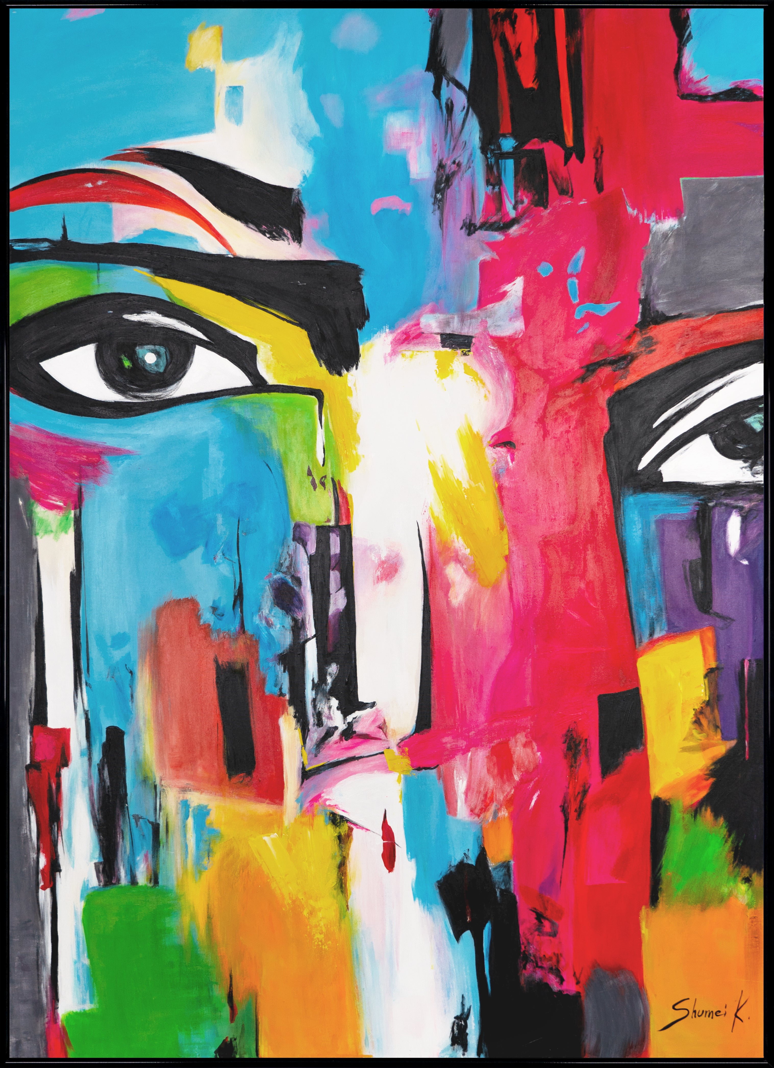 Dieses moderne, abstrakte Porträt wurde komplett in Handarbeit geschaffen. Die lebhaften Farben und kräftigen Linien verleihen dem Gesicht eine intensive Ausdruckskraft, die jeden Raum bereichert. Der Rahmen ist nach Wunsch anpassbar, sodass er sich perfekt in Ihr Einrichtungskonzept einfügt. Mit unserem kostenlosen Versand erhalten Sie dieses Kunstwerk in nur 1-3 Tagen und können es sofort in Ihrem Zuhause präsentieren.
